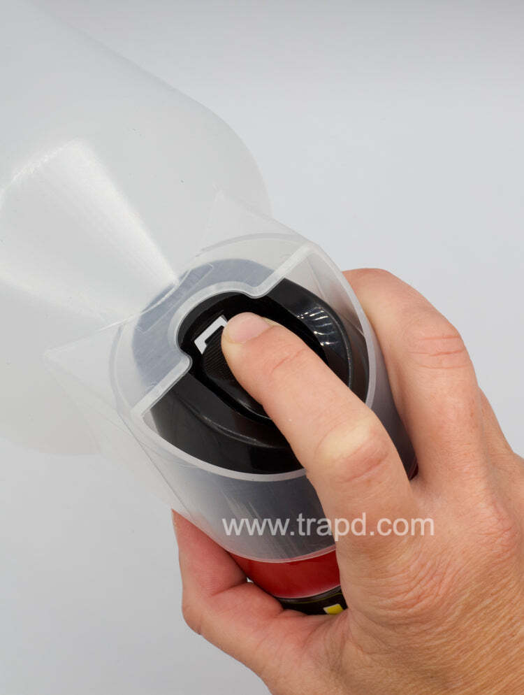 Hold the bug spray canister with Trap'd attached in your hand. Aim the large open end of Trap'd towards the targeted bug or the area where you want to apply the bug spray. Once the bug has been Trap'd press the spray button on the bug spray can to release the insecticide and kill the bug! Start with a small amount of bug spray and wait a few seconds and if needed apply a second spray until the bug is dead.